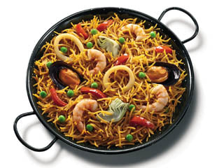 Nouilles aux moules, crevettes, calamars, poivrons, les artichauts et les petits pois.